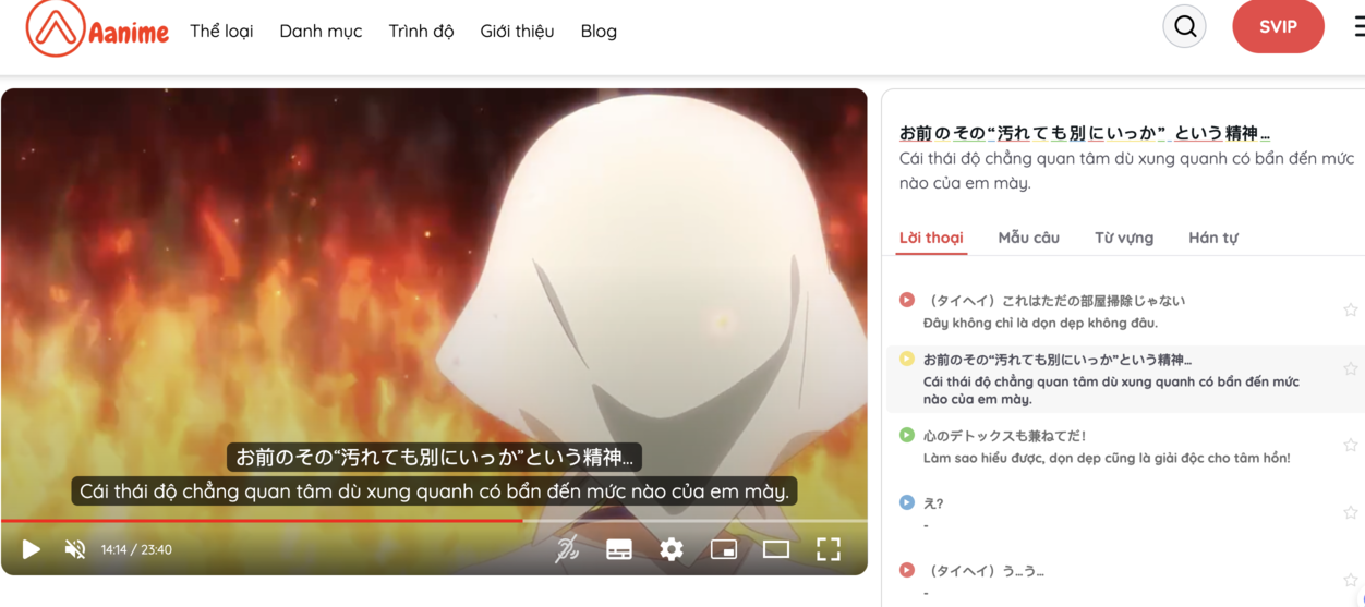 Không chỉ đơn thuần là trang web phim, Aanime.tv còn cung cấp những tính năng đặc biệt để tối ưu hóa trải nghiệm học tiếng Nhật của bạn. Bạn có thể tùy chọn bật tắt phụ đề song ngữ và furigana hán tự để đáp ứng nhu cầu cá nhân và tăng cường khả năng nghe và đọc của mình. Đặc biệt, bạn còn có thể tra từ vựng và hán tự trực tiếp trong phim, giúp bạn mở rộng vốn từ và hiểu rõ hơn về ngữ cảnh sử dụng. Ngoài ra, Aanime.biz còn hiển thị bảng lời thoại của nhân vật, giúp bạn theo dõi và hiểu rõ hơn về diễn biến câu chuyện. Aanime.biz không chỉ là nơi bạn học tiếng Nhật qua những bộ phim anime hay mà còn là một cộng đồng học tập sôi động giúp luyện giao tiếp tiếng Nhật hiệu quả. Bạn có thể kết nối và trao đổi với những người đam mê học tiếng Nhật qua Anime vietsub, đề luyện thi JLPT chia sẻ kinh nghiệm và thảo luận về những bộ phim yêu thích. Tại đây, bạn có thể tương tác với cộng đồng người học tiếng Nhật khác, hỏi đáp, chia sẻ những cảm nhận và gợi ý về những bộ phim hay để mọi người cùng khám phá và luyện nghe hiểu tiếng Nhật. Đặc biệt, Aanime.tv không ngừng cập nhật anime mới nhất và đa dạng để đáp ứng mọi nhu cầu của người học. Bạn sẽ luôn tìm thấy những bộ phim mới nhất, từ các bộ anime hay phổ biến đến các bộ phim truyền hình và điện ảnh đình đám. Điều này giúp bạn không chỉ nâng cao kỹ năng ngôn ngữ mà còn mở rộng kiến thức về văn hóa và giải trí Nhật Bản.