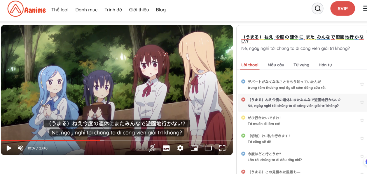 Hiện nay, nhiều nền tảng học tiếng Nhật qua phim như Aanime.tv đã tích hợp các công cụ hỗ trợ học tập như tra từ trực tiếp trên phụ đề, lưu từ vựng và lặp lại câu thoại. Nhờ những tính năng này, mỗi video có thể trở thành một bài học hoàn chỉnh giúp người học luyện nghe, học từ vựng và rèn luyện phản xạ giao tiếp.