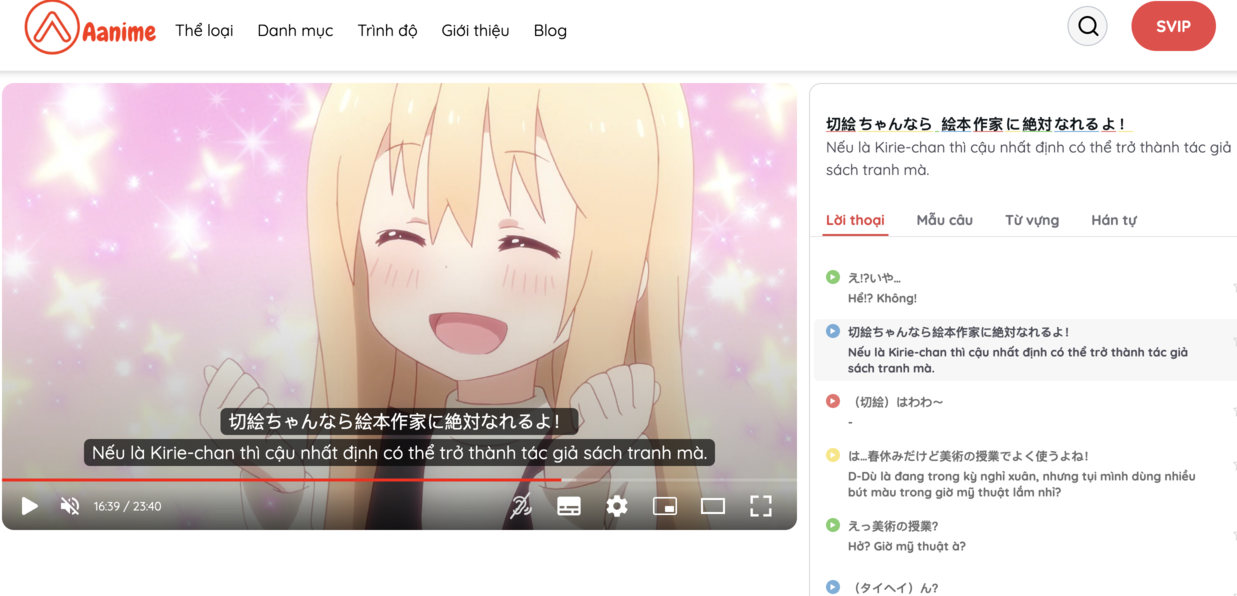Với Aanime.tv, luyện nghe tiếng nhật qua phim trở nên thú vị, linh hoạt và hiệu quả. Bạn có thể tận dụng tính năng đặc biệt của trang web như bật tắt phụ đề song ngữ, furigana hán tự và tra từ vựng trực tiếp, học giao tiếp tiếng Nhật để tùy chỉnh trải nghiệm học tập của mình. Từ việc nghe và đọc phụ đề, bạn có thể nắm vững ngữ pháp, từ vựng và cấu trúc câu tiếng Nhật. Bảng lời thoại nhân vật và phương pháp học tiếng nhật online cung cấp cho bạn sự luyện nghe và hiểu rõ hơn về cách diễn đạt và ngữ điệu trong tiếng Nhật. Đến với Aanime.biz, bạn sẽ khám phá một thế giới tiếng Nhật tuyệt vời thông qua những bộ phim đầy thú vị và hấp dẫn giúp luyện kaiwa tiếng Nhật. Hãy tận hưởng trải nghiệm học tập sáng tạo và độc đáo này để nhanh chóng nắm bắt tiếng Nhật một cách tự nhiên và thú vị. Đừng chần chừ, hãy truy cập Aanime.tv ngay hôm nay và bắt đầu hành trình học tiếng Nhật qua phim cùng chúng.
