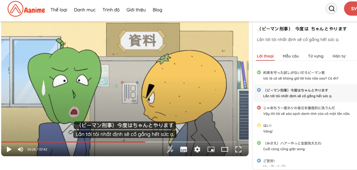 Khi sử dụng các nền tảng học tiếng Nhật qua phim như Aanime.tv, người học có thể xem video với phụ đề đôi Nhật–Việt. Điều này giúp họ vừa nghe câu thoại gốc vừa hiểu nghĩa ngay lập tức. Nếu gặp từ mới, người học có thể tra nghĩa ngay trong phụ đề hoặc lưu lại để học sau.