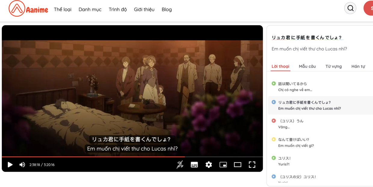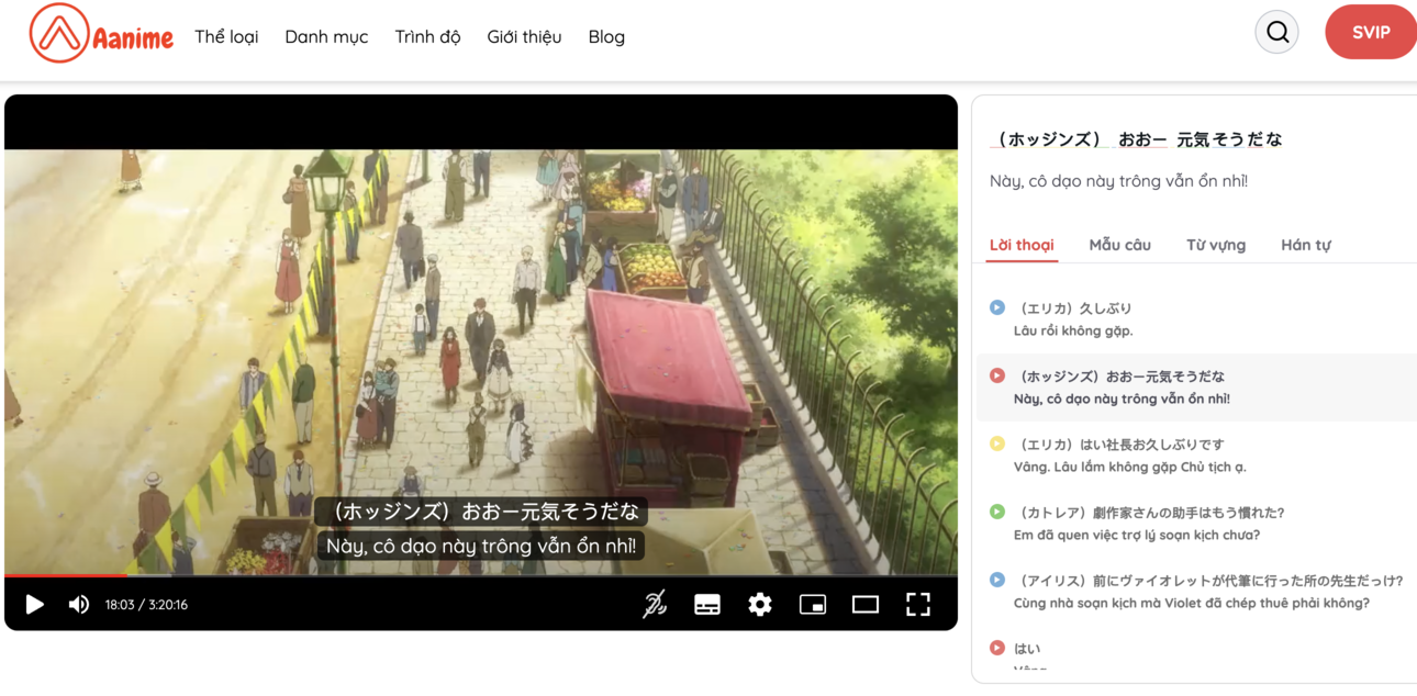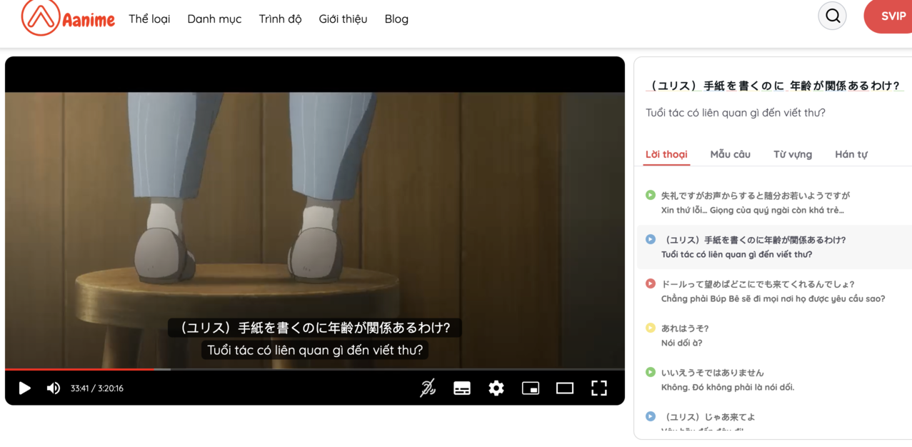 Một trong những nền tảng được nhiều người học nhắc đến là Aanime.tv. Nền tảng này cho phép người học xem các đoạn phim tiếng Nhật với phụ đề Nhật – Việt, tra từ vựng trực tiếp trên màn hình và lặp lại từng câu thoại để luyện phát âm. Nhờ những tính năng này, người học có thể biến việc xem phim thành một quá trình học tập hiệu quả.