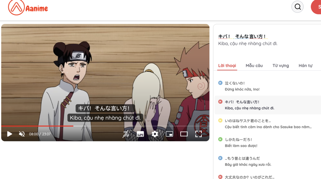 Aanime.tv cho phép người học lưu lại câu thoại và tra cứu ngay lập tức, giúp việc học theo cụm trở nên thuận tiện hơn.